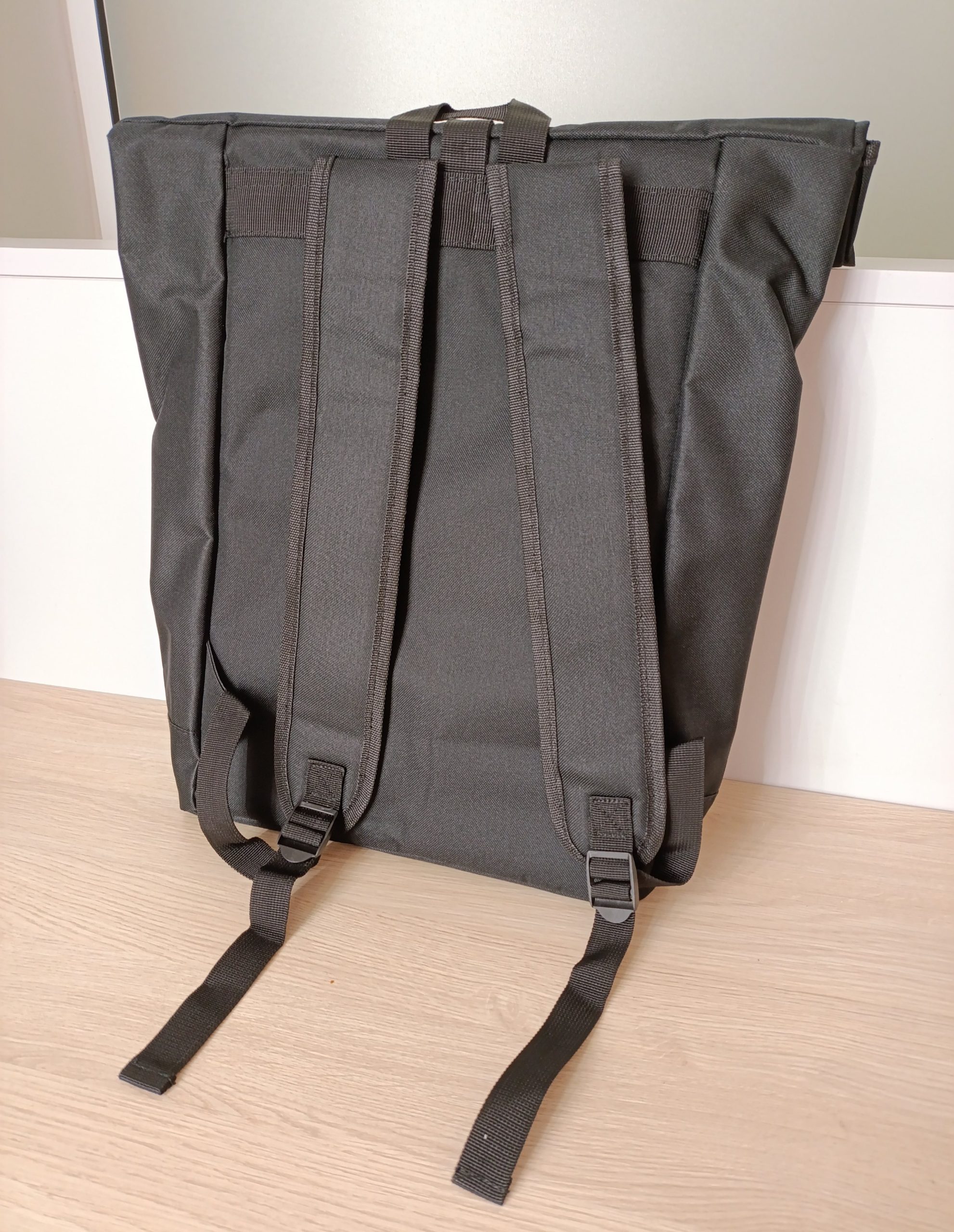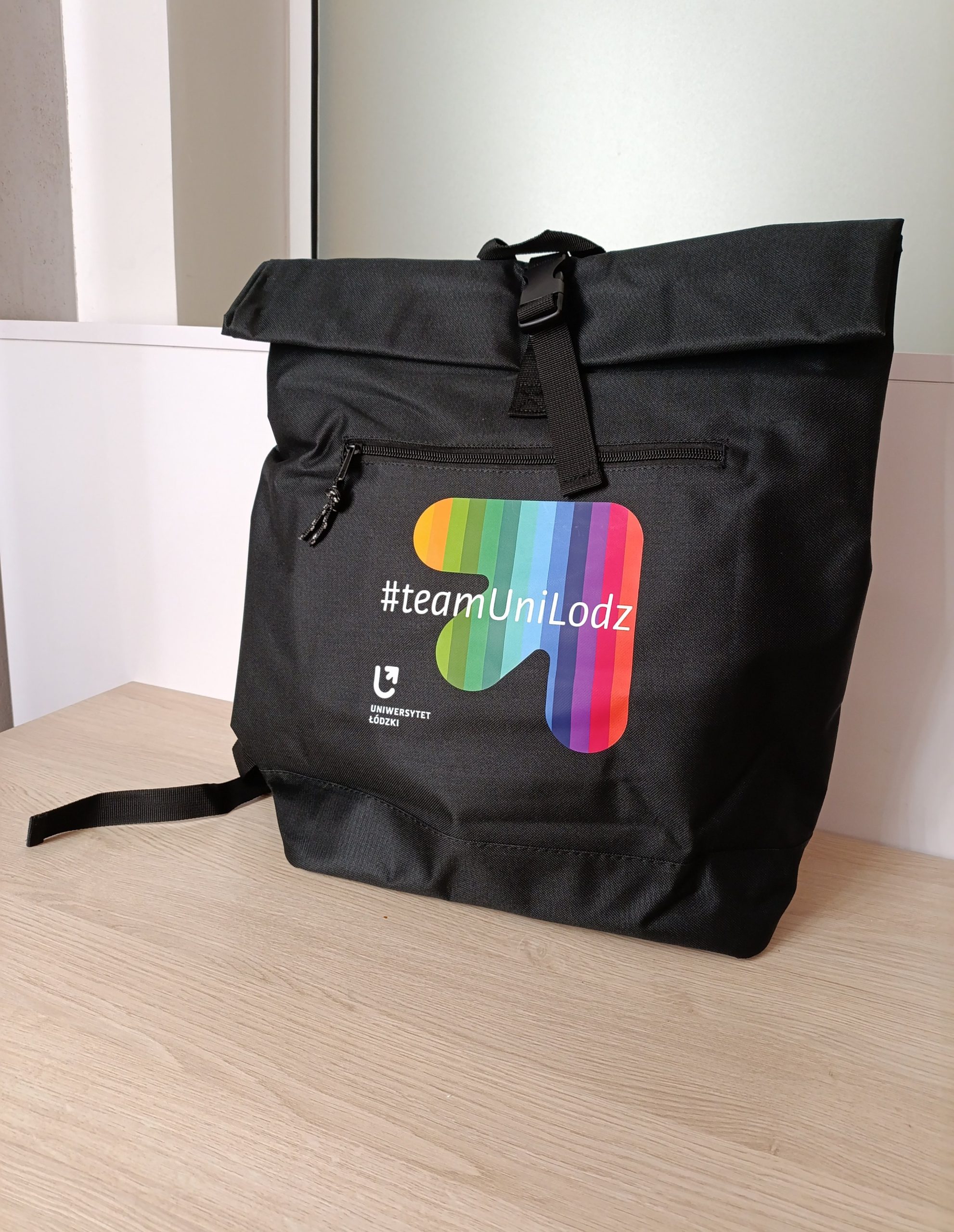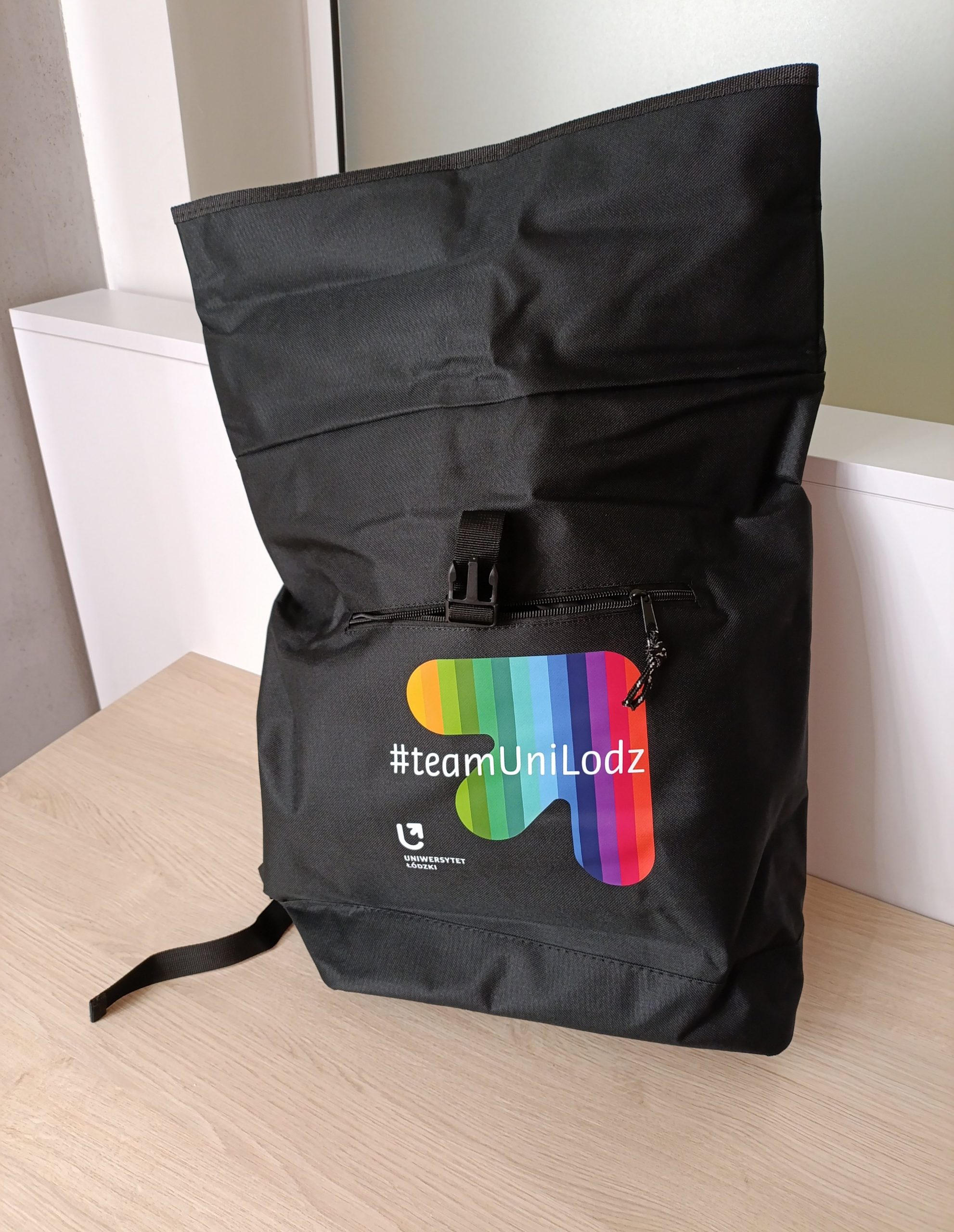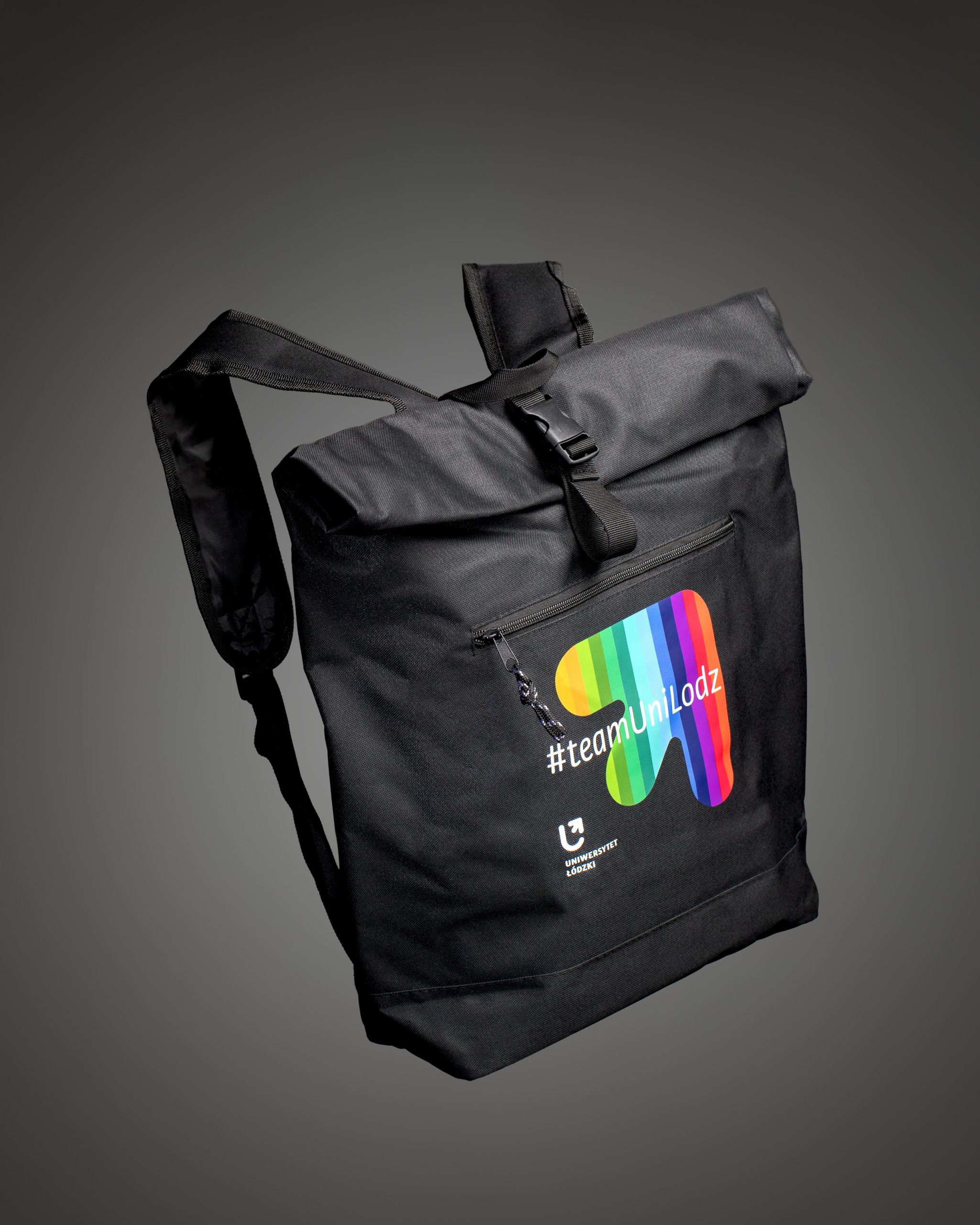 Plecak typu rolltop ze zwijaną górną częścią. Posiada zewnętrzną, zasuwaną kieszeń oraz przegrodę wewnątrz. Wykonany z poliestru, z kolorowym logo oraz napisem #unilodzteam. Wymiary : 42 cm x 12 cm x 43 cm (60 cm po rozwinięciu)